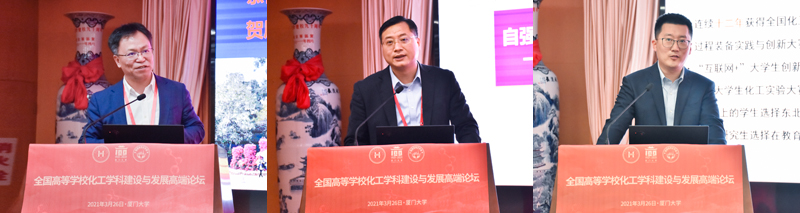 田中群院士、中国化工教育协会会长郝长江先生、中国化工学会副理事长兼秘书长华炜女士和福建省化工学会理事长、集美大学校长李清彪教授也进行致辞,共同表示了对论坛成功召开的祝贺和促进校际化工教育交流合作的愿景。两位论坛组织委员会主席田中群院士和李清彪理事长一道缅怀了陈嘉庚先生的爱国精神,倡导与会专家共同研讨我国高校化工学科的发展策略,助力厦大化工学科的更快进步。