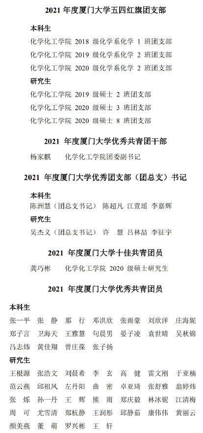 在学校和学院党委以及上级团组织的坚强领导下,2021年yl6809永利官网团委工作紧紧围绕团的根本任务、政治责任和工作主线,特别是在共青团改革、全面从严治团、服务青年需求、夯实基层团建、服务百年校庆、参与疫情防控等重点工作方面取得了显著成绩。在2021年度厦门大学共青团工作先进集体和先进个人评选中,学院团委副书记杨家麒老师荣获厦门大学年度“优秀共青团干部”称号;2020级硕士研究生龚巧彬荣获厦门大学“十佳共青团员”称号;2018级化学系化学 1 班团支部等6个支部荣获厦门大学“五四红旗团支部”称号;陈洲慧等8名学生荣获厦门大学“优秀团支部(团总支)书记”称号;张一平等50名学生荣获厦门大学“优秀共青团员”称号(名单附后)。