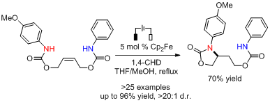 酰胺氮自由基在有机合成中具有重要的应用前景,但是其形成方法很有限,这直接限制了酰胺氮自由基在合成中的应用。徐海超教授课题组致力于发展绿色自由基化学。课题组发现利用廉价、易得的二茂铁为电催化剂,以电作为“氧化剂”氧化易得、稳定的酰胺N–H键可高效得到酰胺氮自由基。并利用电催化条件下形成的氮自由基和未活化烯烃的分子内加成反应发展了具有高选择性的烯烃氢胺化反应。该反应是硕士生熊鹏发现,由硕士生朱琳和熊鹏共同完成。博士生茅中一成功将该反应用于雄激素受体调节剂的高效合成中。