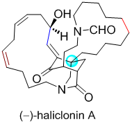 天然产物的全合成是有机化学的核心研究领域之一,不仅体现一个国家有机合成化学的综合实力,而且将为开展具有自主知识产权的药物研发提供技术支撑和物质基础。Haliclonin A是韩国Shin小组从韩国水域一种蜂海绵属Haliclona海绵中提取出的一种与sarains生物碱生源合成途径相似而又具有独特结构特征的大环生物碱,具有抗菌、杀虫及抗肿瘤等生物活性。Haliclonin A的结构独特性在于其桥环内酰胺-酮核心骨架,桥环两侧分别各交叉连结着一个大环亚结构,并含三个叔碳手性中心和一个桥头全碳季碳手性中心。由于该天然产物核磁共振氢谱复杂,部分立体化学尚未确定,且其绝对立体化学存在相互矛盾的结论。这些使得其全合成具有挑战性。