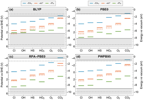 电化学界面极为复杂,为了更好的理解电化学固液界面电荷转移过程,必须将固相和液相(水)的电子结构(包括能带结构、缺陷和溶液离子电子能级)放在同一电子结构理论水平上处理研究。而程俊教授采用近年来课题组发展的基于密度泛函理论的分子动力学模拟(DFTMD)与自由能微扰理论相结合的方法,巧妙的攻克了这一科学难题(Cheng et al. Acc. Chem. Res., 2014, 47, 3522)。但是计算的精度很大程度上局限于密度泛函理论中泛函近似的误差。近期,他们首次采用最新的随机相位近似(random phase approximation)和双杂化泛函(double hybrid)的方法计算了水相中六个氧化还原对的电子能级结构,并把它们和水的电子能级排列在相对于计算标准氢电极的同一能级水平上(如图),计算精度大大提高。这一重要研究进展克服了计算电化学在界面模拟研究上的局限性,能够允许我们精确地将计算结果与实验结果进行分析对比。同时,两种方法都很好的描述了溶质和水的电子能级结构,给予全局的计算研究电化学界面带来了希望。
