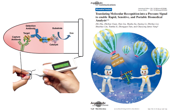 近日,yl6809永利官网杨朝勇教授课题组与田中群院士课题组及厦门大学附属成功医院(解放军174医院)病理科季天海教授课题组合作,首次提出了基于气压检测的新一代生物医学检测技术,相关研究结果以“Translating Molecular Recognition into Pressure Signal for Rapid, Sensitive, and Portable Biomedical Analysis”为题,在《德国应用化学》上发表扉页论文(Angew. Chem. Int. Ed. 2015, 54, 10448-10453)。