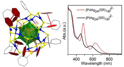 硫醇保护的金属团簇因其为稳定贵金属纳米颗粒的缩影而备受关注。金、银虽属同族金属,但至今却未有硫醇保护金、银纳米团簇拥有相同结构的报道。在明星金纳米团簇Au25(SR)18的结构被确定后,就有大量有关Ag25(SR)18、Ag掺杂Au25(SR)18的合成和性质研究,理论计算也预测了Ag25(SR)18可能具有与Au25(SR)18类似的结构,但一直未被实验证实。该工作通过引入Pd和Pt,成功地获得了硫醇保护的[MAg24(SR)18]2-(M=Pd, Pt)富银团簇,并解析了其单晶结构。结构分析表明,[MAg24(SR)18]2-团簇虽具有类似Au25(SR)18的骨架结构,由一个M@Ag12实心二十面体内核和六个[Ag2(SR)3]表面“订书针”单元组成,但不同的是[MAg24(SR)18]2-团簇表面的六个[Ag2(SR)3]单元存在不同程度的扭曲,相邻[Ag2(SR)3]单元存在着Ag×××S非共价键相互作用。而存在的Ag×××S相互作用也促进了表面配体上苯环的π-π作用,使[MAg24(SR)18]2-存在两种不同表面配体分布的手性团簇。此外,该工作也表明在金属团簇中掺杂异金属可作为一种调控团簇电子结构和光学性能的有效途径,即便是仅仅一个原子的掺杂也会引起团簇性质的变化。