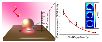 随着纳米技术的发展,几个纳米之内的纳米尺度表征具有非常重要的意义。用光学手段达到远低于衍射极限的空间分辨率具有非常大的挑战。在本论文中,作者利用等离激元增强二次谐波(PESHG)机理发展了非线性“纳米尺”,可以达到将近1 nm的分辨率。利用壳层隔绝纳米粒子Au@SiO2,通过调节壳层厚度,形成纳米尺度的纳米间隙,将间隙尺寸与PESHG信号相关联,得到“PESHG 纳米尺方程”。另外,实验和理论都证实,“热点”被转移至薄膜-纳米粒子间隙之间,确保得到的PESHG信号几乎全部来自于这一区域而且被极大地增强。PESHG纳米尺有望成为一种超灵敏光学手段来测量纳米尺度间距,并且具有很高的光谱精度和很好的信噪比。