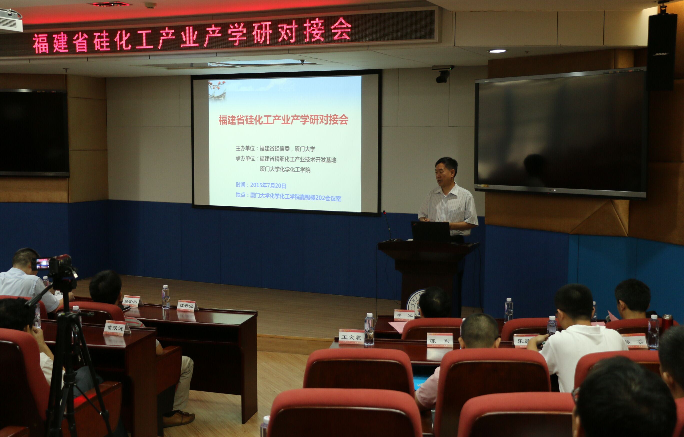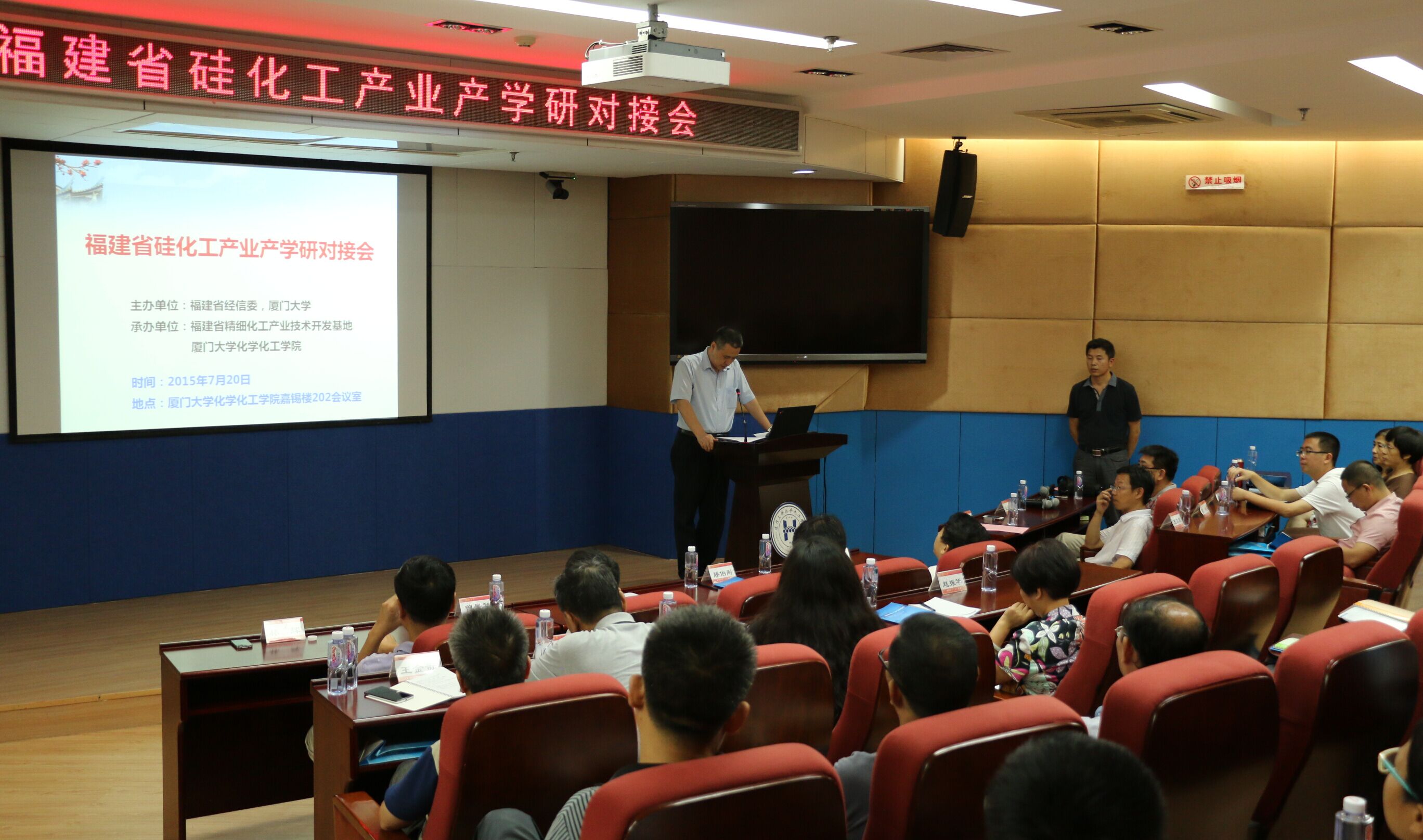 2015年7月20日,由福建省经济和信息化委员会(经信委)与厦门大学共同主办,福建省精细化工产业技术开发基地、yl6809永利官网承办的“福建省硅化工产业产学研对接会”在yl6809永利官网卢嘉锡楼举行。福建省经信委领导、相关地市部门领导、十余家硅化工相关骨干企业、协会负责人、技术人员以及厦门大学、福建师范大学相关校、院领导、专家五十余人参加了此次对接会。福建省经信委严效东副主任、厦门大学校长助理滕伯刚教授出席会议并致辞。