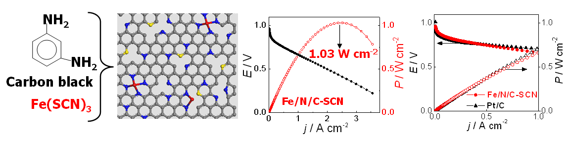 孙世刚教授课题组之前采用高含氮量的聚间苯二胺和FeCl3为前驱体通过高温热解制得一种高氧还原活性的Fe/N/C催化剂(J Am Chem Soc, 2014, 136, 10882−10885)。他们发现Fe盐对催化剂的性能有很大影响,最近使用Fe(SCN)3制得的非贵金属催化剂,不但比表面积高,而且还同时掺杂了S,使得催化活性提高了约1倍。该非贵金属电催化剂应用于质子交换膜燃料电池时表现出优异的性能:最大功率密度首次突破了1 W cm-2,是当前该领域的最高值;在燃料电池实际工作的电压区,电池功率密度基本上与基于Pt催化剂的燃料电池相当。
